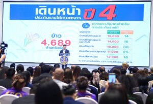นายจุรินทร์ กล่าวว่า ข้าวเป็นพืชเศรษฐกิจหลักที่สำคัญอย่างยิ่งของไทย สถานการณ์ราคาข้าววันนี้ดีขึ้นเป็นลำดับ และถ้าวันไหนราคาข้าวตกต่ำ รัฐบาลนี้ก็ยังมีนโยบายประกันรายได้เกษตรกรผู้ปลูกข้าวชดเชยเงินส่วนต่างผ่านบัญชี ธ.ก.ส.โดยตรง ให้มีรายได้ตามที่ประกันไว้ โดย 4 ปี ที่ผ่านมาจ่ายเงินส่วนต่างให้เกษตรกรไปแล้วถึง 180,000 ล้านบาท ช่วยเติมเงินเข้ากระเป๋าเกษตรกร มีครอบครัวได้เงินส่วนต่างสูงสุดถึง 76,600 บาท และมีเงินอีกก้อนคือไร่ละพัน ไม่เกิน 20 ไร่ต่อครัวเรือน อีกก้อนเข้ากระเป๋าชาวนา