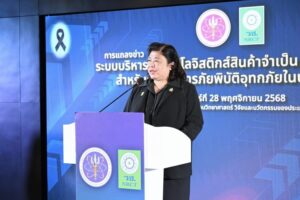 ดร.วิภารัตน์ ดีอ่อง ผู้อำนวยการสำนักงานการวิจัยแห่งชาติ กล่าวว่า สถานการณ์ภัยพิบัติอุทกภัยและสถานการณ์ฉุกเฉินที่ประเทศไทยกำลังเผชิญในปัจจุบัน ถือเป็นภาวะเร่งด่วนที่ต้องอาศัยการบูรณาการความร่วมมือจากทุกภาคส่วน วช. ตระหนักถึงความจำเป็นในการต่อยอดนำผลงานวิจัยและนวัตกรรมมาใช้ประโยชน์อย่างเร่งด่วน โดยได้ต่อยอดงานวิจัยเรื่อง ‘ระบบบริหารจัดการโลจิสติกส์เวชภัณฑ์ที่มิใช่ยา’ (Smart Medical Supply) ซึ่งทำหน้าที่เป็นแพลตฟอร์มกลางในการจัดสรรและกระจายเวชภัณฑ์ที่มิใช่ยาให้แก่โรงพยาบาลตามความต้องการ ช่วยลดปัญหาการขาดแคลน ลดระยะเวลาการช่วยเหลือที่ล่าช้า และเพิ่มประสิทธิภาพการทำงานของระบบสาธารณสุข จึงได้นำระบบดังกล่าวมาประยุกต์ใช้เพื่อสนับสนุนการจัดส่งสิ่งของจำเป็นไปยังโรงพยาบาลและศูนย์พักพิงต่าง ๆ ให้สามารถช่วยเหลือผู้ประสบภัยได้อย่างทั่วถึงและทันต่อเหตุการณ์ยิ่งขึ้น