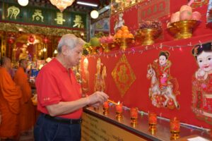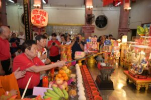 ตั้งจิตอธิษฐานต่อเทพยดาฟ้าดิน (เจ้าแห่งสวรรค์) ขอให้ตนเองและครอบครัว เฮงๆ ตลอดปีมะเมีย
