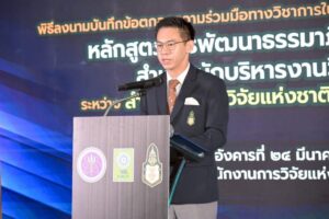 ดร.วิภารัตน์ ดีอ่อง ผู้อำนวยการสำนักงานการวิจัยแห่งชาติ กล่าวว่า วช. ในฐานะหน่วยงานที่มีบทบาทในการส่งเสริมและพัฒนาบุคลากรด้านการวิจัยและนวัตกรรมของประเทศ ตระหนักว่าความเข้มแข็งของระบบวิจัยขึ้นอยู่กับคุณภาพของบุคลากรผู้บริหารจัดการระบบ ซึ่งมีหน้าที่เชื่อมโยงนโยบายสู่การปฏิบัติ กำกับดูแลทรัพยากรสาธารณะ และผลักดันให้งานวิจัยก่อประโยชน์ต่อประเทศและประชาชนอย่างเป็นรูปธรรม โดยหลักสูตรการพัฒนาธรรมาภิบาลและจริยธรรมสำหรับนักบริหารงานวิจัยมืออาชีพภายใต้บันทึกข้อตกลงฉบับนี้ จะมุ่งเชื่อมโยงหลักการสู่การปฏิบัติผ่านการวิเคราะห์สถานการณ์จริง การแลกเปลี่ยนประสบการณ์ และกรณีศึกษา เพื่อพัฒนานักบริหารงานวิจัยให้เป็นมืออาชีพ ควบคู่กับการยึดมั่นในธรรมาภิบาลและจริยธรรม อันจะส่งผลต่อการยกระดับคุณภาพระบบวิจัยของประเทศให้มีความโปร่งใส คุ้มค่า และได้รับความเชื่อมั่นจากสังคมทั้งในระดับประเทศและนานาชาติ